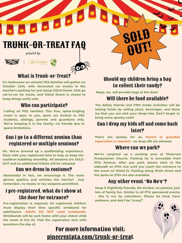 Interested in decorating your parked car and passing out candy to our Pinecrest Parrots in costume? Participants will park their cars in our Teacher Parking Lot, open their trunks, decorate their vehicles, and share treats with students. All distributed candy is supplied by donations to the PTA.